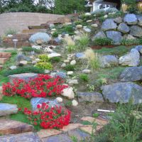 - Sziklakertek: ezek általában a kert a kertben funkció értelmében egy-egy szegletet érintenek. Sok terméskő és sziklakerti növények párosítása a legfőbb jellemzőjük.